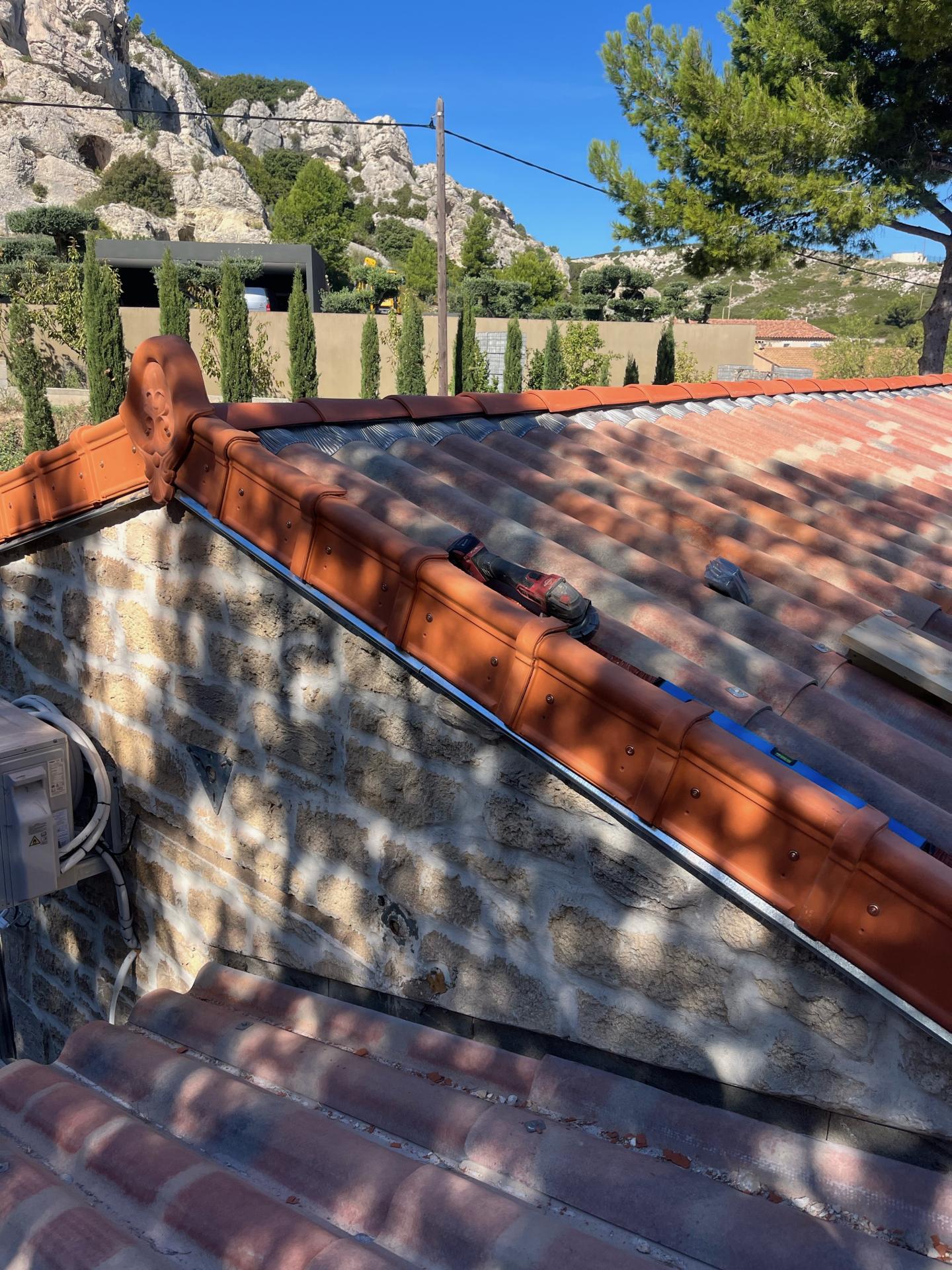 pose de rive angulaire en zing pour faire l’étanchéité entre la toiture et le mur Pose des tuiles de rives universelle fixé avec des vise cuivre avec rondelle étanchéité. Pose du fronton décoratif